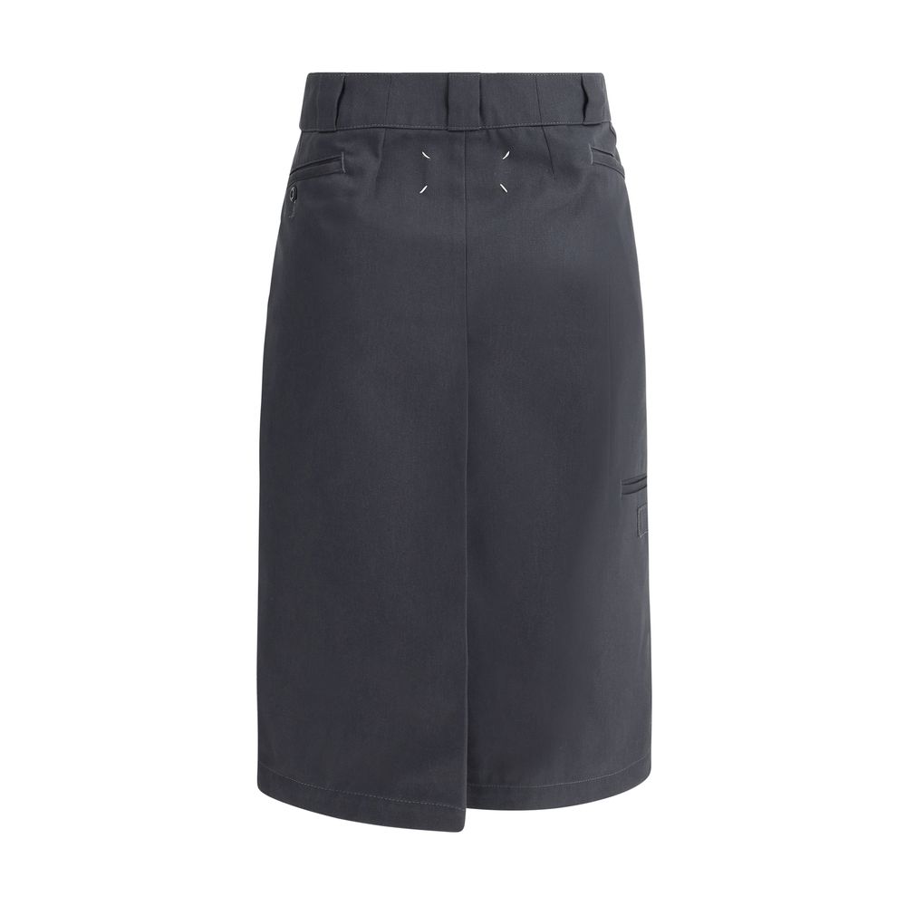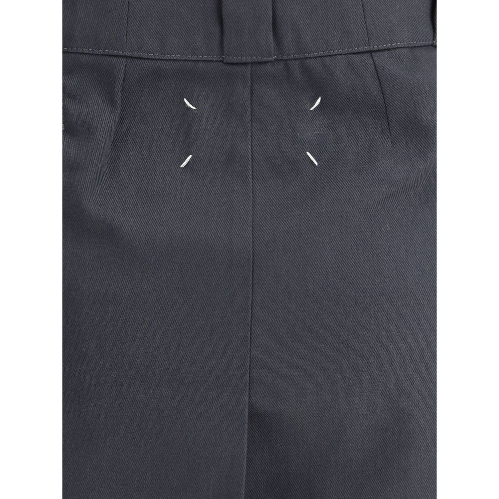 Midi skirt by Margiela, front zipper and hook-and-eye closure, waistband loops, two side welt pockets, three back welt pockets, two pleats on front and back, iconic brand white contrast stitching on back, monochrome pattern, slim fit.