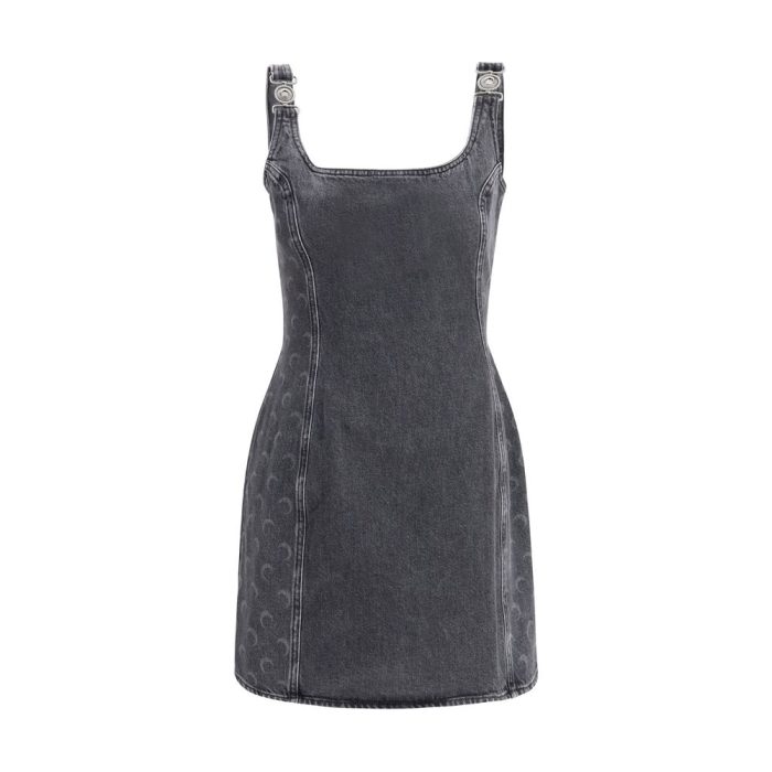 The Moon Laser Denim Sleeveless Mini Dress By Marine Serre embodies a bold, structured aesthetic. The fitted silhouette is framed by a square neckline and gold buckle straps that lend a striking, modern edge. Along the side panels, the signature laser Moon print creates a distinctive graphic contrast against the grey-wash denim. A sleek side zipper ensures ease, while the Marine Serre leather patch completes the piece with the brand’s unmistakable identity.
