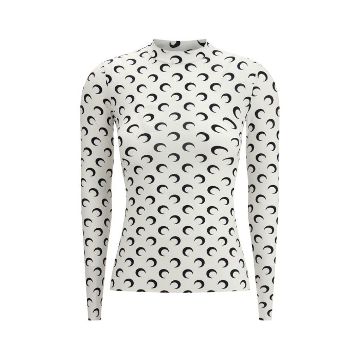 The moon long-sleeved Top by Marine Serre embodies the brand’s signature fusion of elegance and graphic identity. Crafted from stretch fabric, it features a high neck and a slim fit that enhances the silhouette. The all-over crescent moon motif, a hallmark of the Maison, lends the piece a contemporary and refined allure. A versatile and distinctive garment, ideal for completing modern looks with bold sophistication.