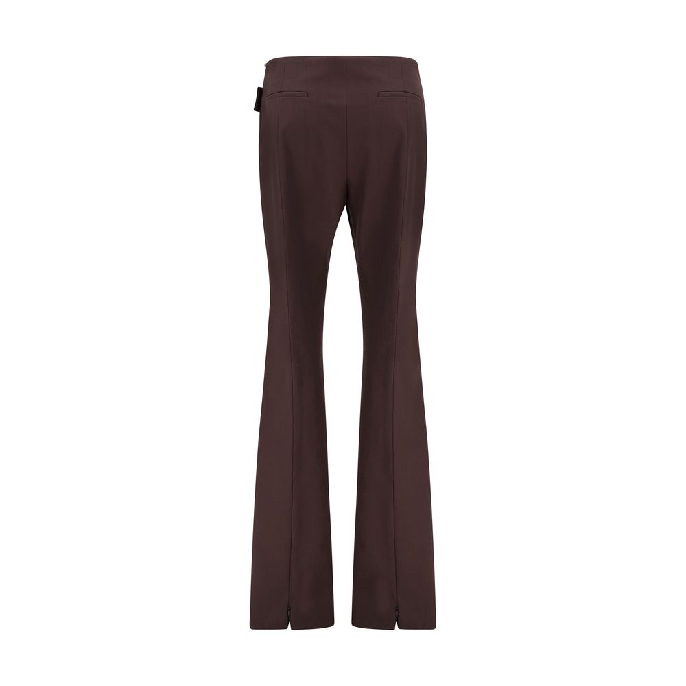 The Slim Trousers with Asymmetric Belt by Sportmax are crafted from a wool blend with a fitted line that naturally follows the silhouette. A slightly low waist and a back ankle zip create a subtle flared effect, while the belt applied on the right hip wraps asymmetrically through the opposite loop for a dynamic detail. Front and back pressed creases enhance the tailored precision of the piece, blending structure and femininity in a refined expression of contemporary elegance.