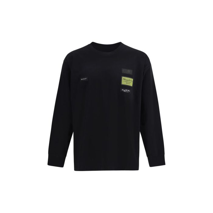 The Long-sleeve T-shirt by MM6 crafted from soft cotton jersey, featuring jacquard label patches on the chest that elevate a functional detail into a refined design element. The clean silhouette is enriched by the round neckline, streamlined long sleeves, and the Maison’s iconic four white stitches on the back, adding a subtle signature touch.