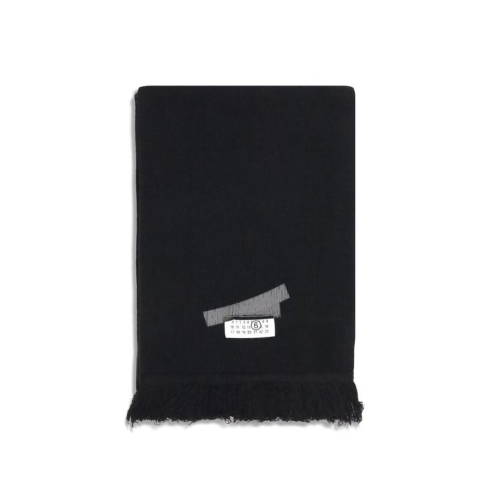 The wool Scarf by MM6 is made of soft knit wool, with an elongated shape that makes it versatile and cozy. Featuring irregular stitches and a raw fringe, it adds a touch of texture to the design. The inverted MM6 signature and number label interrupt the symmetry, creating a striking visual interference that balances the rhythm of the knit with an element of originality and character. An accessory that combines comfort and modernity.