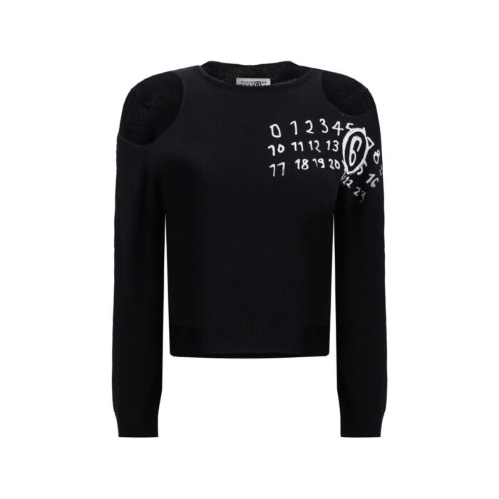 Wool Sweater by MM6, crew neck, iconic contrasting brand logo on front, cut-out detail on front panel, ribbed cuffs, ribbed hem, monochrome pattern.