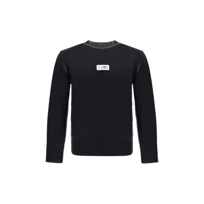 Virgin Wool Sweater by MM6, ribbed crew neck, ribbed hem, ribbed cuffs, embroidered brand logo patch on front.