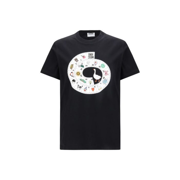 The organic cotton jersey T-shirt by Moschino from the Resort 2026 collection features a playful goose game print on the front. Designed with short sleeves and a clean, comfortable silhouette, it combines graphic creativity with high-quality materials for a modern casual look.