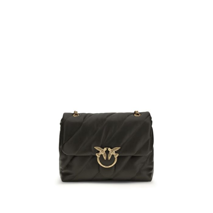 The Love Puff leather Shoulder Bag by Pinko combines style and functionality in a quilted, padded design. The front closure with magnetic button is decorated with the iconic gold-plated Love Birds embossed logo, while the back features a tone-on-tone embroidered monogram. The interior is organized into three compartments, and the sliding chain shoulder strap completes the model, making it elegant and practical.