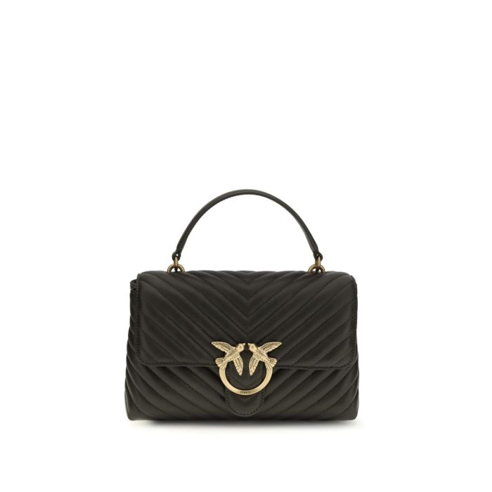 The Calfskin Love Lady Handbag by Pinko, front magnetic button closure, iconic gold-plated and embossed Love Birds logo on front, quilted and padded design, double interior compartment, sliding chain shoulder strap, flat rigid handle at top, interior flat pocket with zipper, iconic tone-on-tone embroidered brand monogram on back.