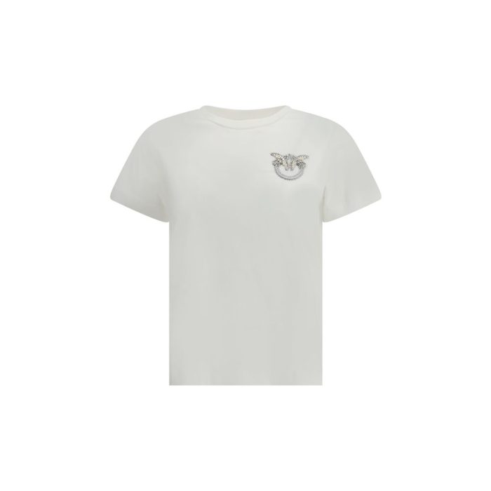 The T-Shirt by Pinko features a logo embroidered with rhinestones and pearls positioned on the left side of the front, adding a precious and refined detail that embellishes the simple and contemporary design of the garment.