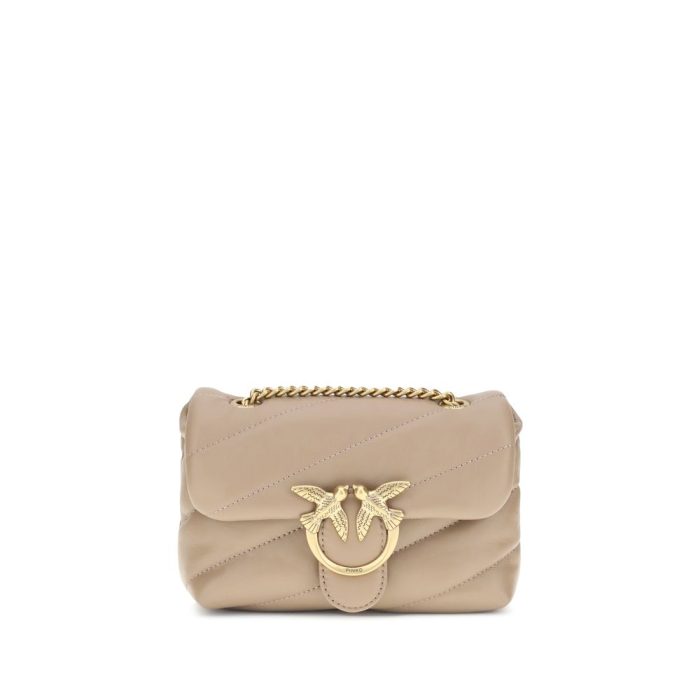 Calfskin Love Baby Shoulder Bag by Pinko, front closure with magnetic button, iconic gold-plated Love Birds logo embossed on the front, quilted and padded design, double internal compartment, sliding chain shoulder strap, iconic brand monogram embroidered tone-on-tone on the back.