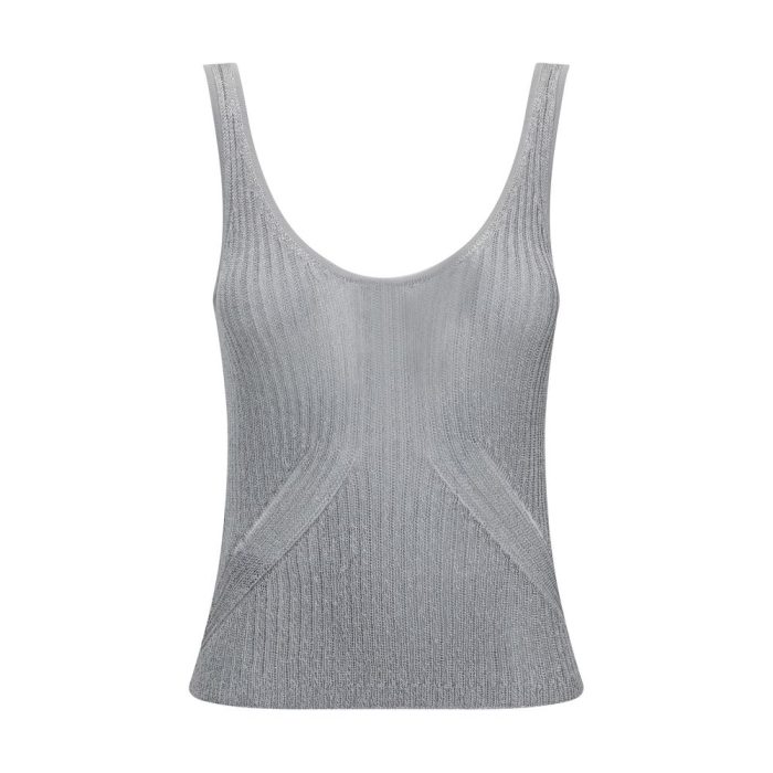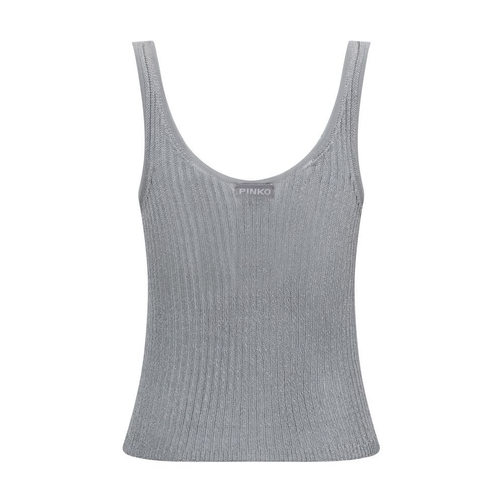 Pinko’s Knit Top is an elegant and refined garment featuring a camisole silhouette that enhances the figure with simplicity and style. Made of a metallic viscose blend knit, it features a semi-transparent weave that gives a light and feminine effect. The wide neckline at the front and thin straps enhance the cleavage line, while the finished piping and logoed label at the center back add sartorial care and recognition to the design.
