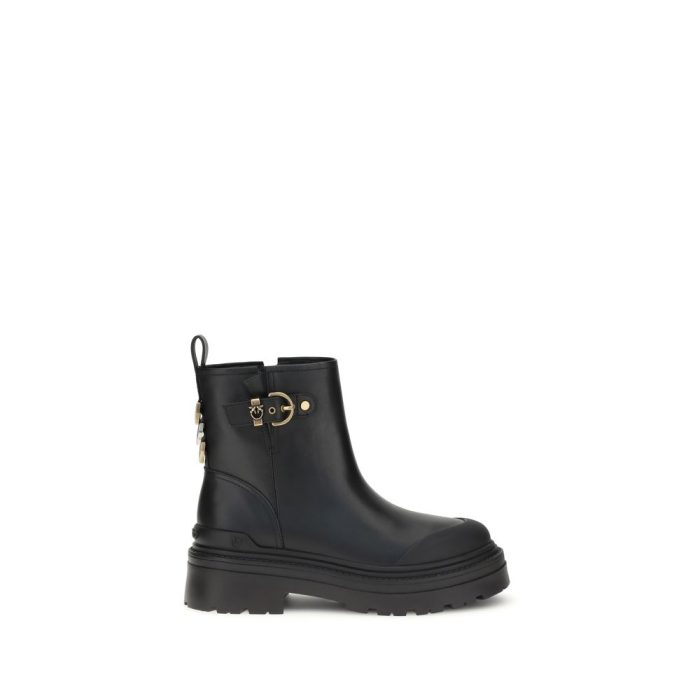 Pinko’s Mia Ankle Boots are made of leather and feature a round toe. They feature a buckle and side zipper closure, an elegant metal Love Birds detail on the side and decorative applique rings on the back. The rubber sole ensures comfort and grip.