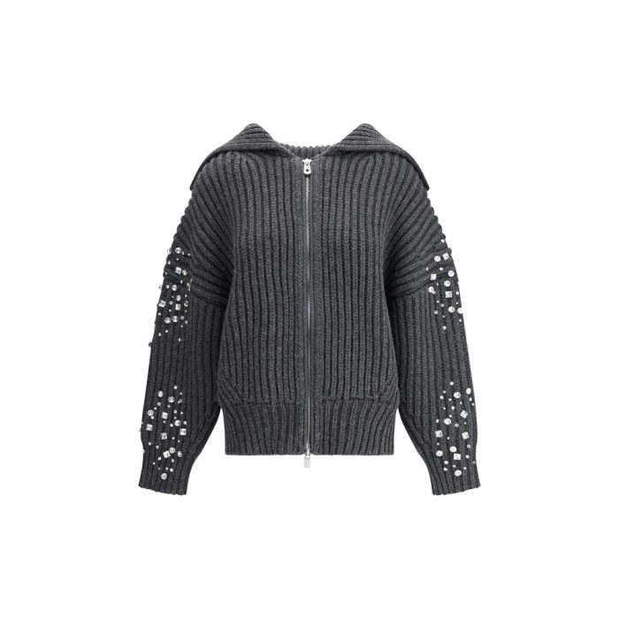 Pinko’s wool Cardigan features a large ribbed design and front zipper closure, giving it a modern and practical look. Applied rhinestones on the sleeves add a touch of sparkle and femininity, transforming the garment into an elegant and contemporary piece.