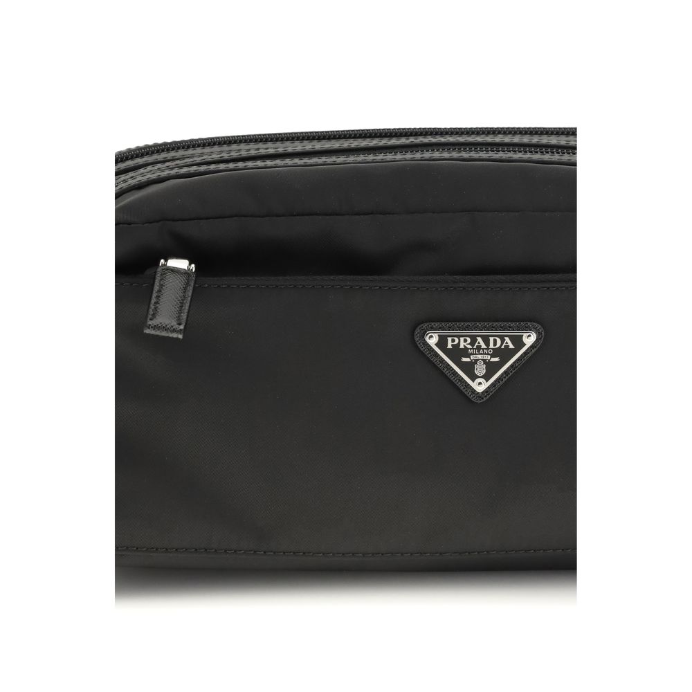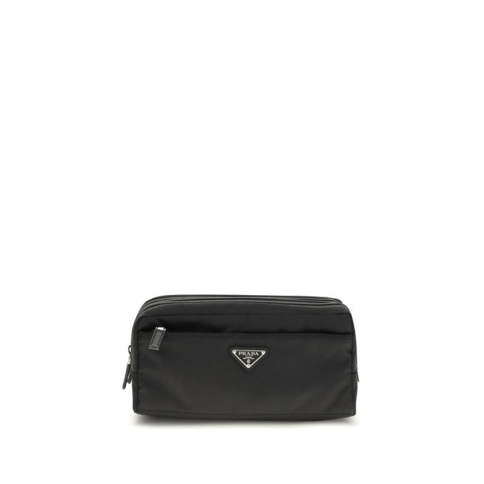 The Re-Nylon Beauty Case by Prada combines elegance and functionality thanks to Saffiano leather inserts and the iconic logoed metal triangle on the front. It features a zippered closure, a front pocket and a back pocket both zippered, and a lined interior complete with an additional zippered pocket to better organize every essential.