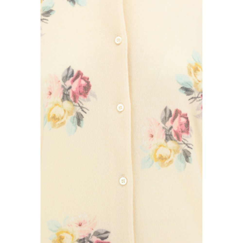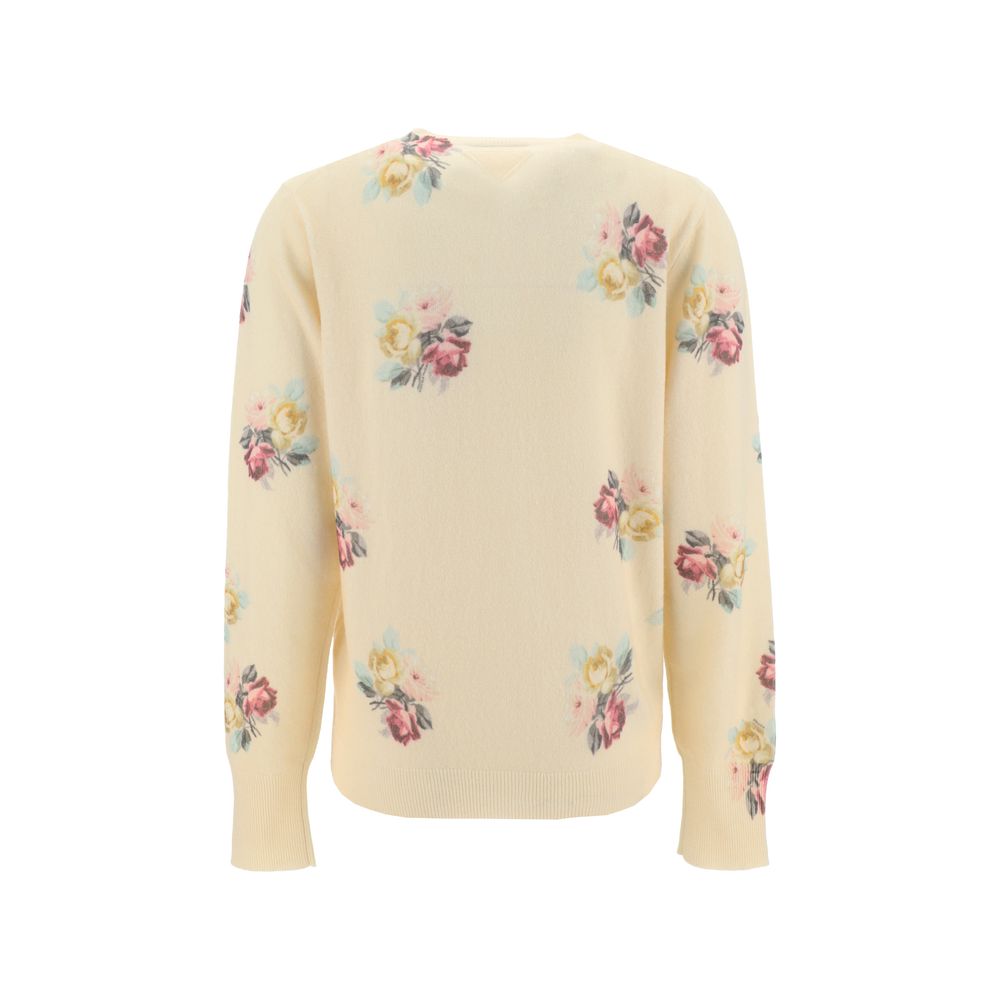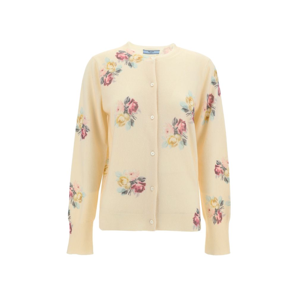 Virgin Wool Cardigan by Prada, ribbed crew neck, button front closure, ribbed neckline, ribbed hem, floral pattern on front and back, regular fit.