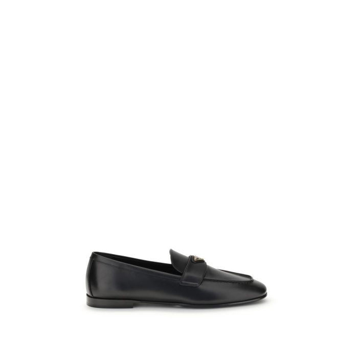 Prada’s smooth leather Loafers combine classic elegance and contemporary identity. Characterized by a flat sole and squared toe, they feature a tray finished with the iconic logoed triangular plaque, a distinctive detail that signs the essential design with understated sophistication.