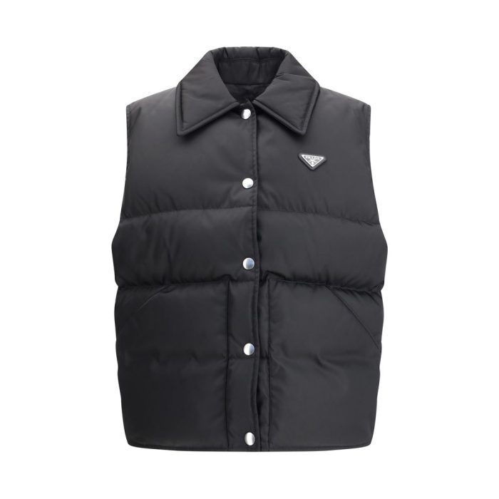 Prada’s padded re-nylon Vest combines sustainability and distinctive design. Featuring a classic collar and a snap-button closure, this garment provides practicality and style. The two front welt pockets offer functionality, while the iconic triangular plaque on the front adds an instantly recognizable brand touch, making the vest a versatile and contemporary must-have.