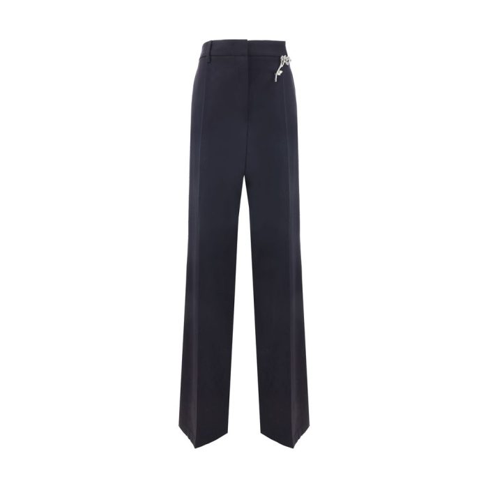 Wool Pants by Prada, front hook-and-eye and zipper closure, two side slash pockets, two welt pockets at back, belt loops at waistband, bright jewel brooch detail applied to front, monochrome pattern, regular fit.