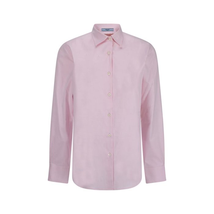 Cotton Shirt by Prada, classic collar, button front closure, adjustable button cuffs, asymmetrical hem, back panel with adjustable martingale pattern strap, monochrome pattern, regular fit.