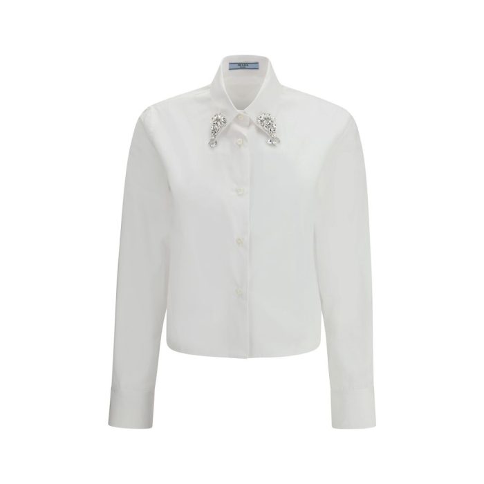 Cotton Shirt by Prada featuring a classic collar, a front button closure, a cropped style, an appliqued shiny jewel detail on the collar, a monochrome pattern, and a regular fit.