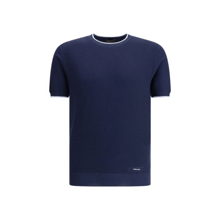 Prada’s Short Sleeve Sweater features a ribbed crew neck and ribbed hems, offering a comfortable, well-defined fit. Contrasting edges add a distinctive, modern touch to the design. The brand’s iconic logo is visible, emphasizing Prada’s recognizable character. This sweater combines a casual and elegant look, perfect for a contemporary and sophisticated style.