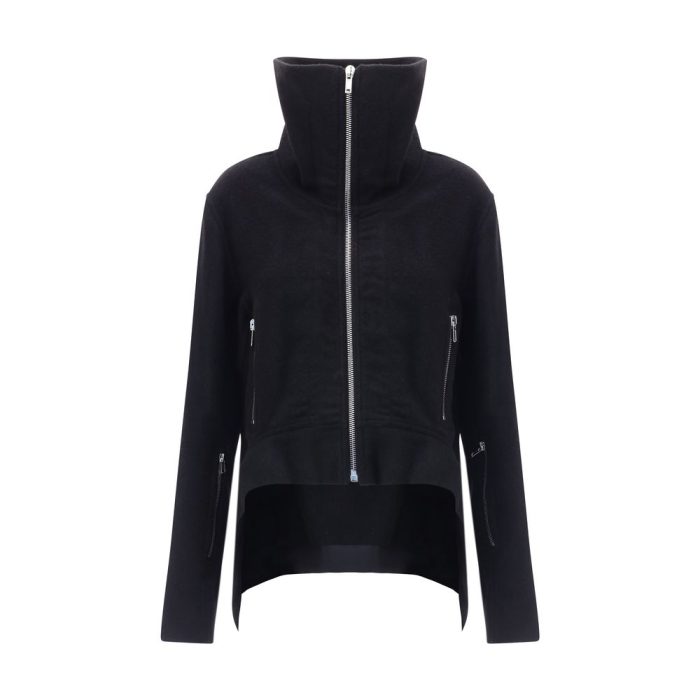 Rick Owens virgin wool Exploder Jacket, featuring a high collar and front zip fastening. It features two side zipped welt pockets, adjustable zipped cuffs and a symmetrical hem with a longer back panel, for a dynamic and contemporary effect. A functional garment with a distinctive style.