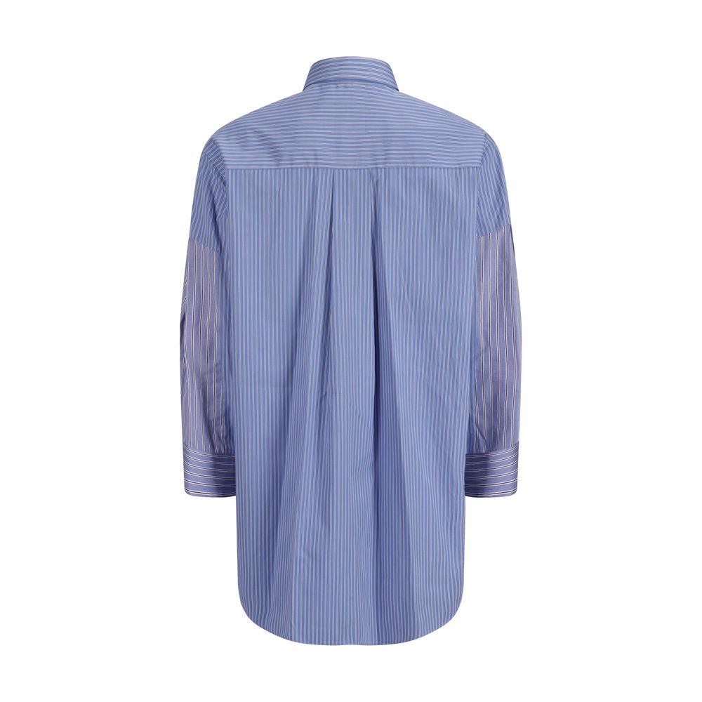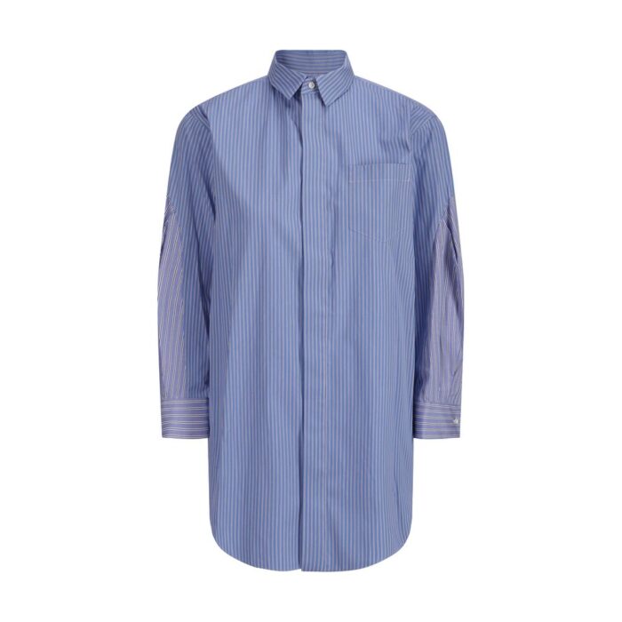 Cotton Chemisier Dress by Sacai, classic collar, front closure by concealed buttons, two side welt pockets, adjustable cuffs by buttons, striped pattern, regular fit.