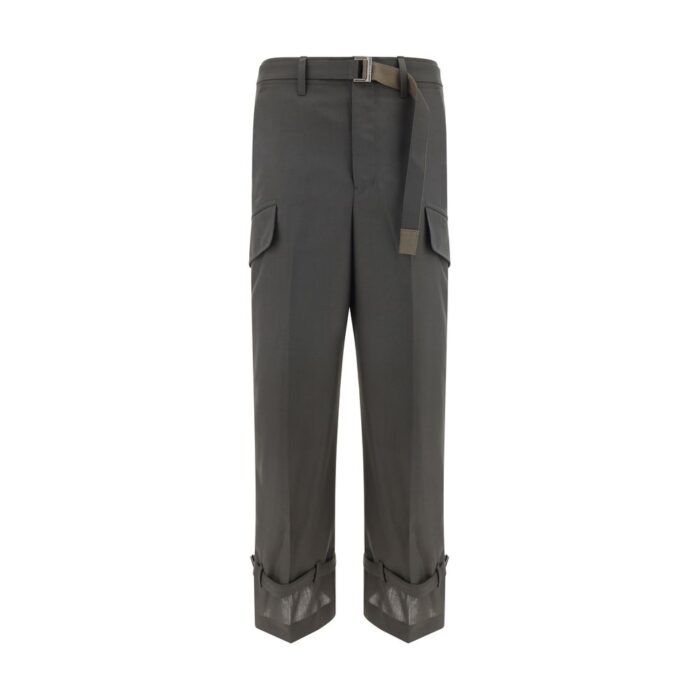 Pants by Sacai, front button and zipper closure, two side slash pockets, two back welt pockets, waistband loops, adjustable and removable matching belt, two flap welt pockets on side panels, adjustable hem with attached belt, monochrome pattern, regular fit.