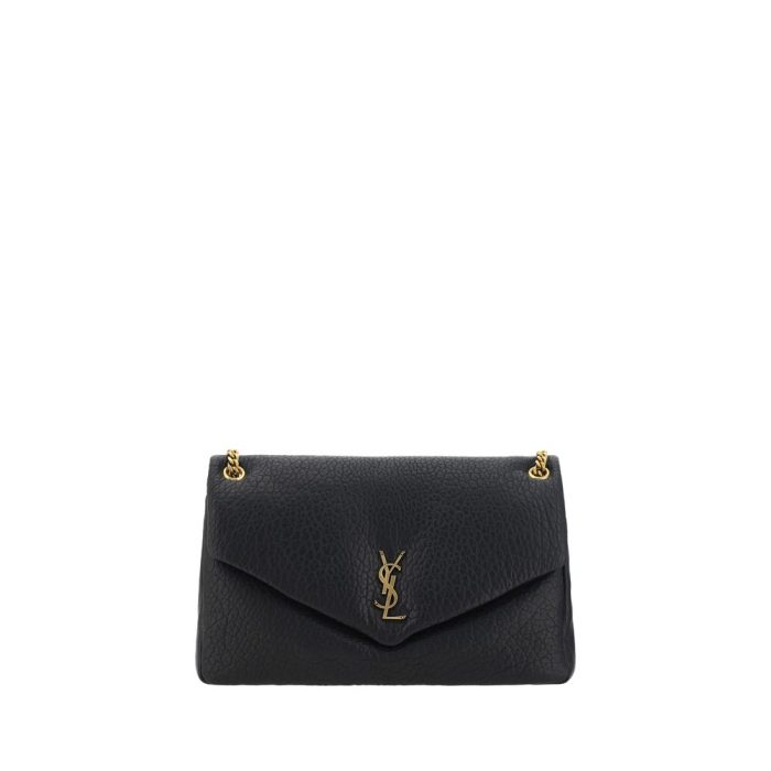 Lambskin Calypso Shoulder Bag by Saint Laurent, magnetic flap closure at front, three-dimensional plaque with iconic brand logo embossed on front, single internal compartment, leather shoulder strap with sliding chain detail.