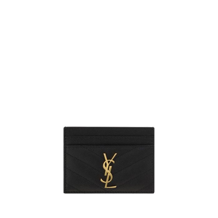 Calfskin Card Holder by Saint Laurent, quilted matelassé design, front plaque with iconic three-dimensional YSL logo, card slots on front and back, bill compartment on top.