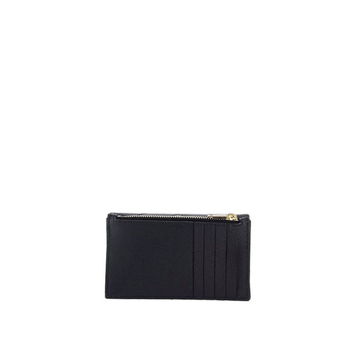 Black Calfskin Card Holder by Saint Laurent, brass logo plaque on front, quilted texture, snap botton closure on front, back card slots and zip coin purse.