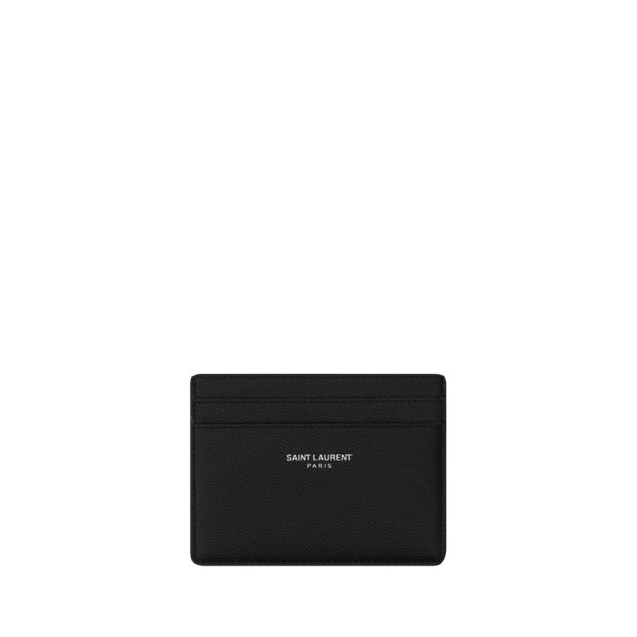 Leather Grain De Poudre Credit Card Holder from Saint Laurent, two slots card on front and back, one open pocket for coins, embossed brand logo on front.