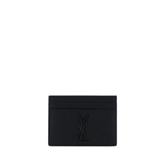 Calfskin Card Holder by Saint Laurent, card slots on front and back, plaque with iconic brand logo embossed on front.