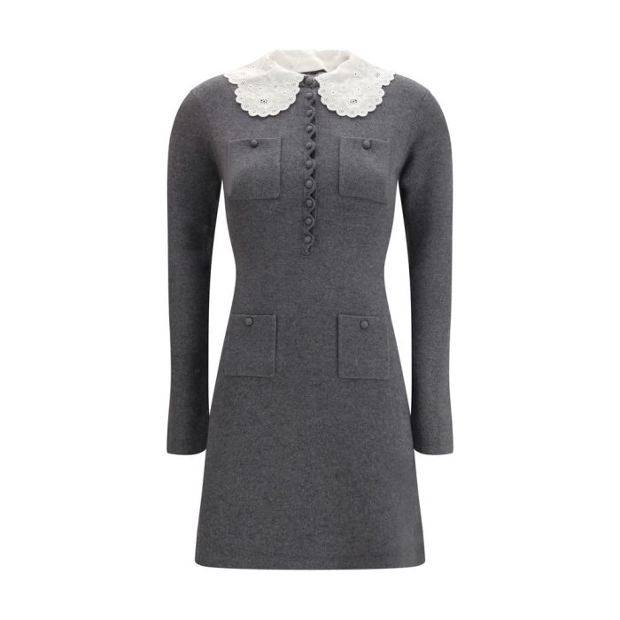 The knit mini Dress by Self-Portrait combines everyday elegance with refined detailing. Crafted in a cotton and cashmere blend with natural stretch, it follows the body with a softly fitted silhouette. A contrast broderie anglaise collar adds a romantic, vintage-inspired accent, while the button-down front and functional pockets introduce a tailored, contemporary touch. Designed to transition seamlessly from day to evening, it balances comfort and sophistication with ease.