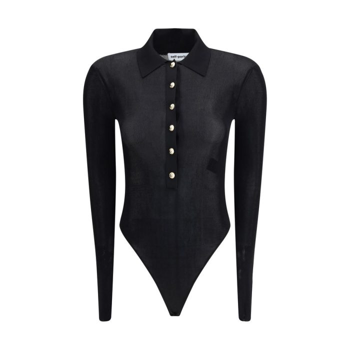 Self-Portrait’s knit Bodysuit combines elegance and practicality in a refined design. Featuring long sleeves and a classic collar, it has a front closure with embossed buttons that add a precious touch. The closure on buttoned briefs ensures comfort and a flawless fit, perfect for curated, feminine looks.