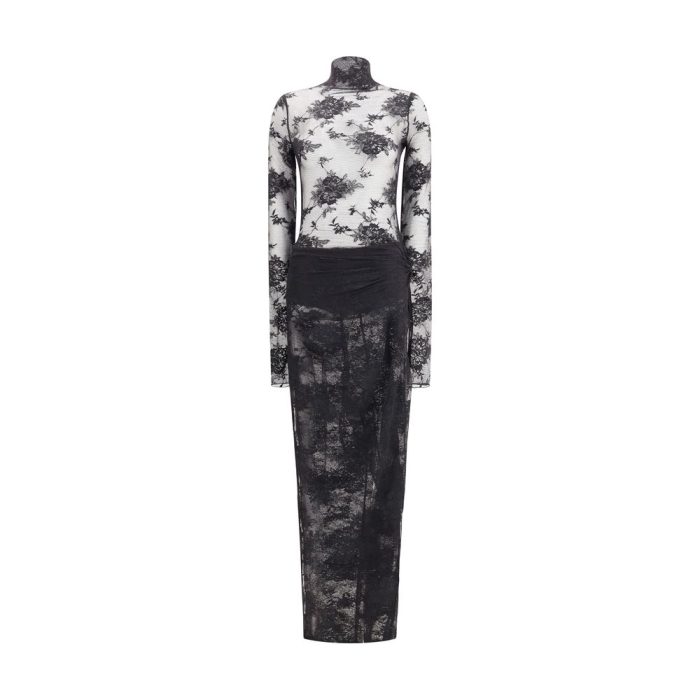 The Tessa sheer Lace Jumpsuit by The Andamane is a bold, sensual piece that plays with structure and contrast. Featuring a turtleneck with an open back, it comes with long sleeves and a knotted drape detail at the waist that enhances the silhouette. Hidden beneath the flowing maxi skirt with a dramatic slit are full-length leggings, adding an unexpected modern twist. A button closure secures the turtleneck in place, completing a refined and striking design.