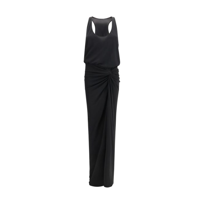 The Juno maxi Dress by The Andamane expresses a fluid femininity through interlock jersey that follows the body with effortless softness. The relaxed tank design features a scoop neckline at the front and a racerback, while the knotted waist creates elegant draping that shapes the silhouette. A high slit adds movement and dynamism, completing a piece with a contemporary and graceful balance.