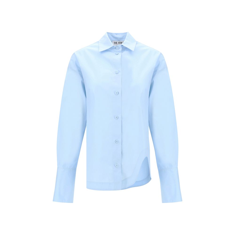 Cotton Eliza Shirt by The Attico features classic collar, front closure by matching buttons, wide oversized bell sleeves, shaped slit, iconic tone-on-tone embroidered brand logo.