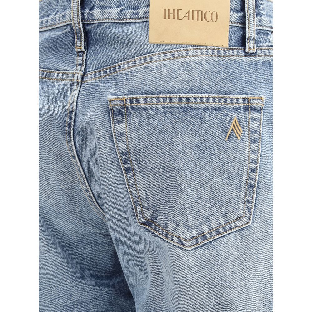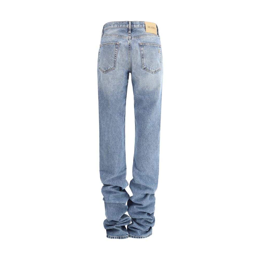 Cotton Jeans by The Attico, five-pocket style, very long leg detail and gathered at the bottom, front button closure, belt loops for waistband, iconic branded signature leather pressure-printed patch applied at the back.