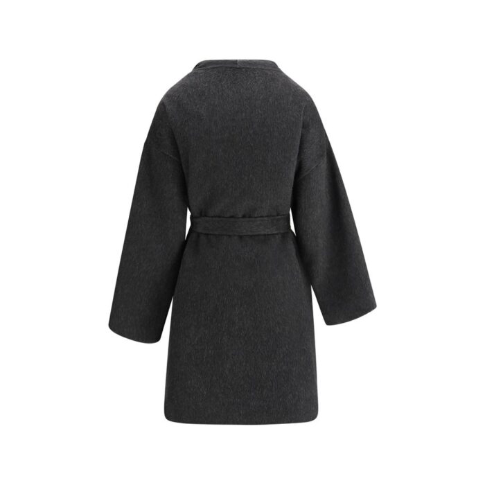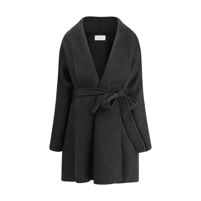 Cashmere Timor Coat by The Row, wide shawl lapels, two side welt pockets, closure by matching knotted sash waistband, monochrome pattern, loose fit.