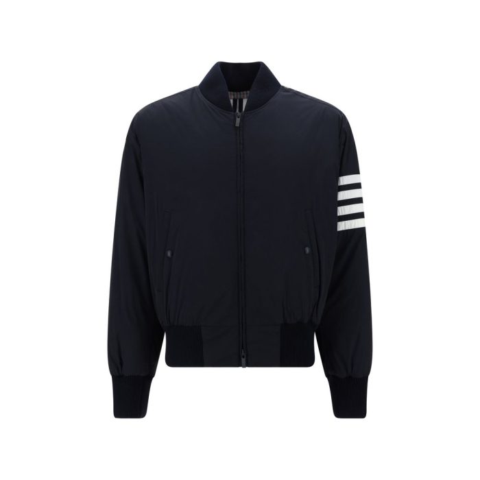 Bomber Jacket by Thom Browne features an essential design with a sporty-elegant style. Crafted with a high crew neck, elastic ribbed cuffs and hem, it features a front zipper closure and two zippered welt side pockets. The distinctive detail is the brand’s iconic contrasting printed bands on the left arm. Regular fit for a versatile look, perfect for pairing with both casual and more formal outfits.