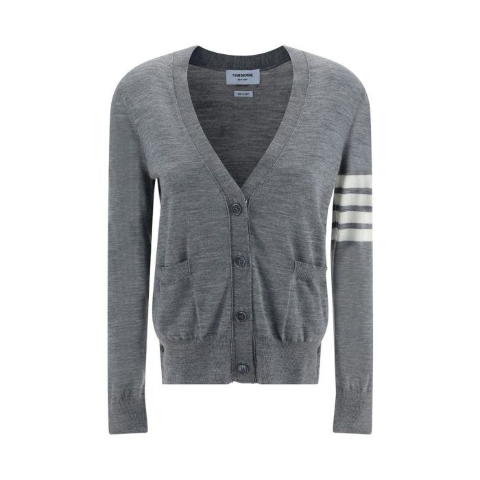 Thom Browne Cardigan made of soft merino wool, featuring a monochrome design and slim fit. Featuring a V-neck with ribbed trim, it has a front button closure and two patch pockets on the front. The brand’s iconic horizontal bands decorate the left arm, adding a distinctive touch. Slight adjustable side slits with buttons complete the garment, for greater freedom of movement. A refined and versatile garment, perfect for smart or casual looks.