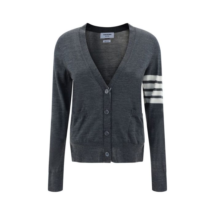 Thom Browne Cardigan made of soft merino wool, featuring a monochrome design and slim fit. Featuring a V-neck with ribbed trim, it has a front button closure and two patch pockets on the front. The brand’s iconic horizontal bands decorate the left arm, adding a distinctive touch. Slight adjustable side slits with buttons complete the garment, for greater freedom of movement. A refined and versatile garment, perfect for smart or casual looks.