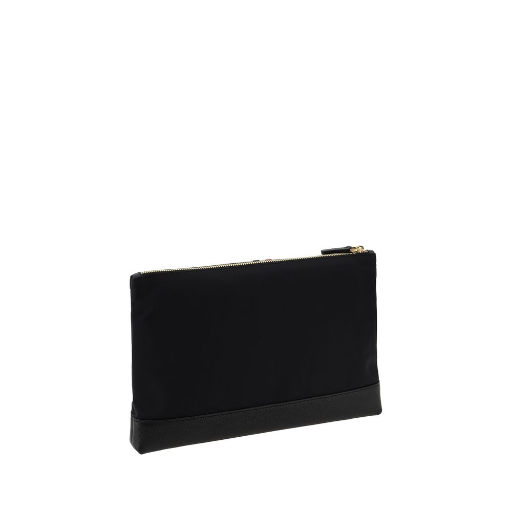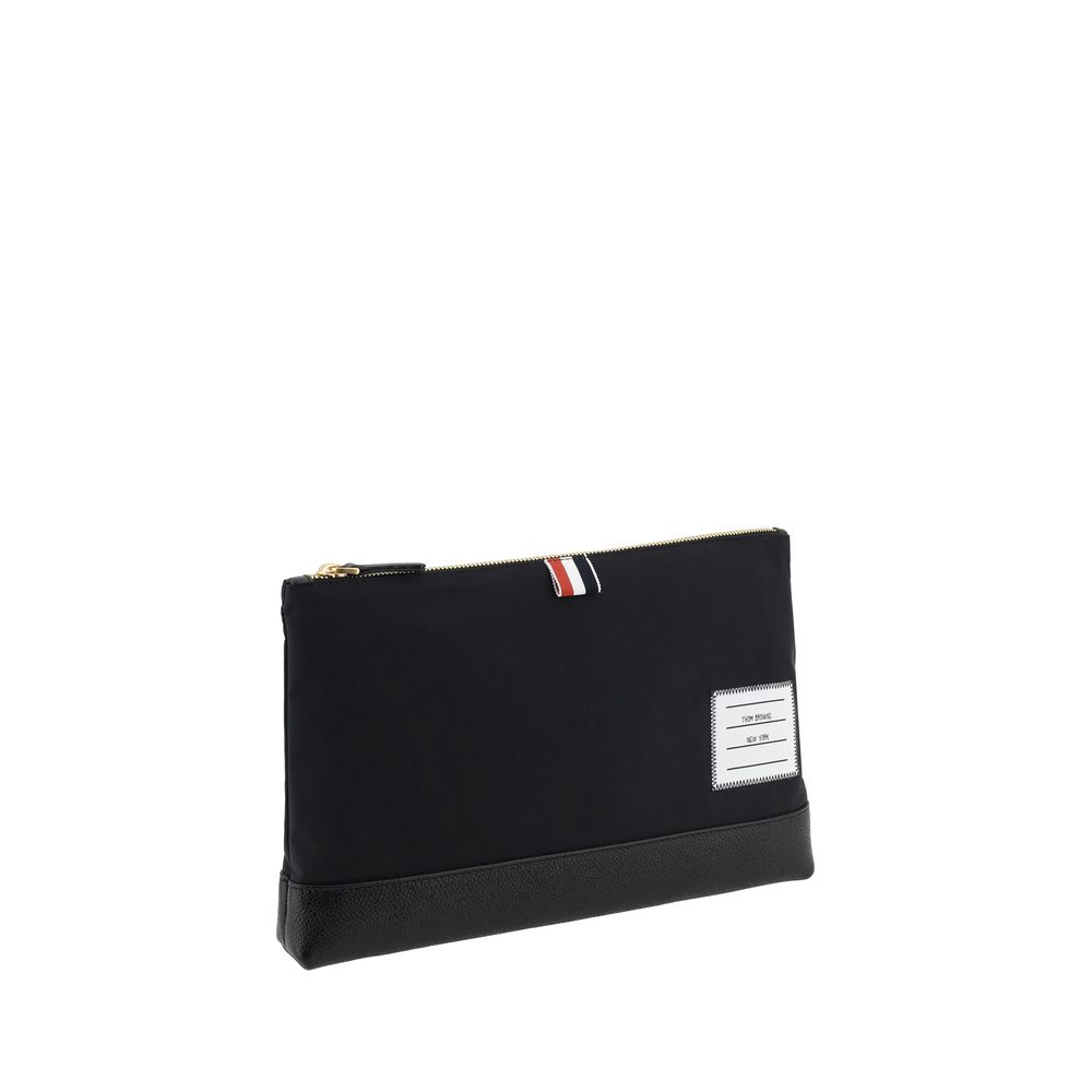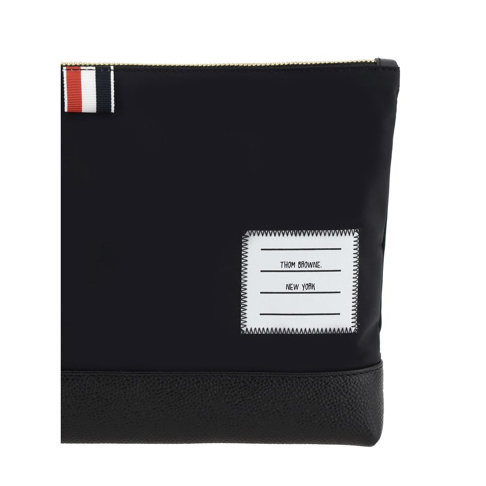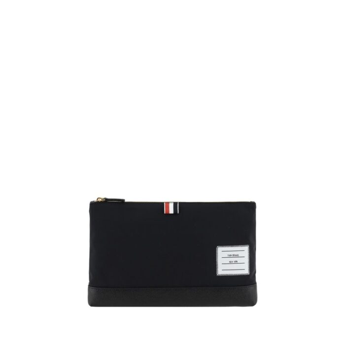 Pouch Bag by Thom Browne, top zipper closure, leather base, brand’s iconic logo patch applied on front, iconic colored band sewn on front, single interior compartment.