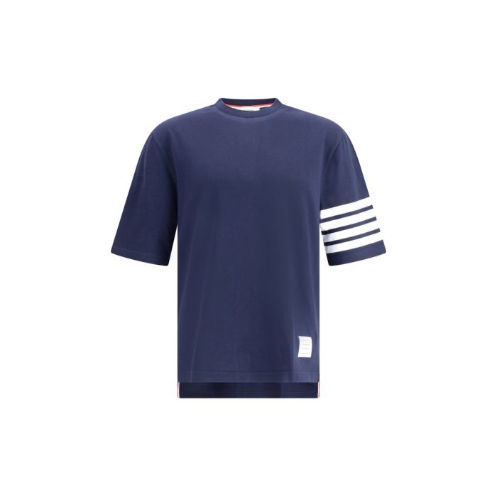 The Striped T-Shirt by Thom Browne features a classic and elegant design with a distinctive striped detail. Complemented by a logo plaque, a ribbed crew neck and a straight hem, this T-shirt combines simplicity and sophistication, making it a versatile garment for any occasion.