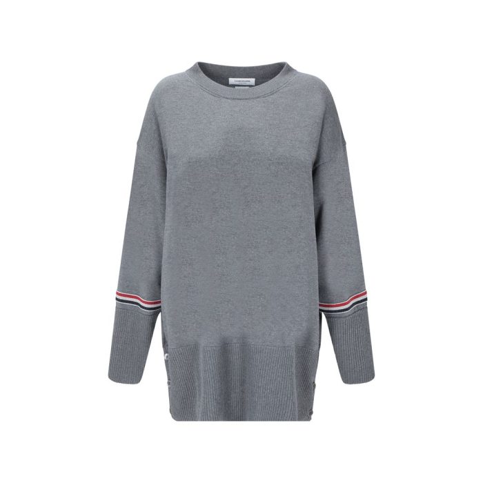 Fleece Wool Sweater by Thom Browne, ribbed crew neck, two side slits with button closure, ribbed cuffs embellished with the brand’s iconic multicolored bands, monochrome pattern, regular fit.