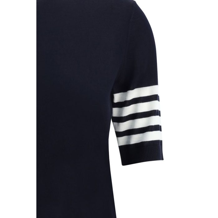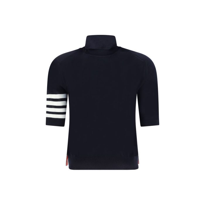 Thom Browne’s Virgin Wool Turtleneck Sweater is a refined and sophisticated piece that combines elegance with distinctive details. With a ribbed turtleneck and short sleeves, it features a monochrome pattern enhanced by contrasting hems. The brand’s iconic bands on the left sleeve and the ribbed hem with slight side slits add a touch of originality.