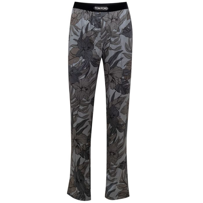 Long nightgown. Made of silk with a floral pattern in shades of gray and green. Elasticated waist with Tom Ford logo on the edge. Comfortable fit.