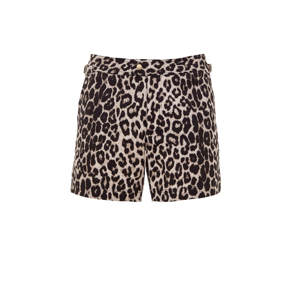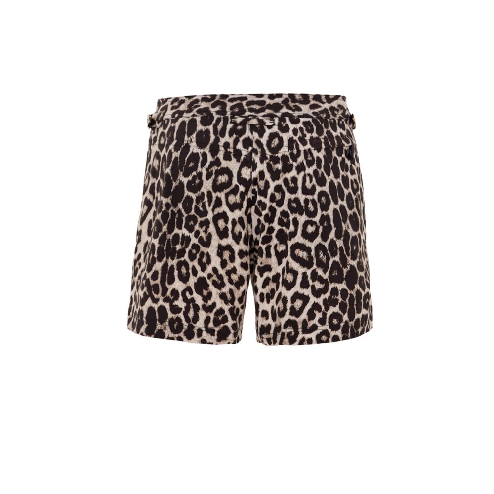 Boxer/shorts model, black/white animalier print, gold snap button fastening, covered zip, two side pockets and one back pocket closed with hidden zip. Inner slip.