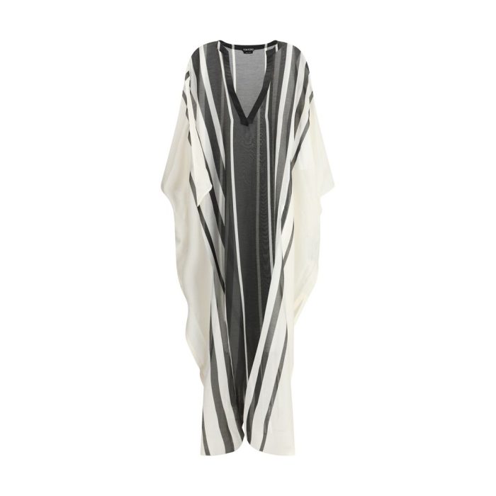Tom Ford’s silk kaftan dress is a light and sophisticated piece, featuring a front neckline that enhances the cleavage line. The vertically striped pattern lends impetus to the silhouette, while the fluidity of the silk ensures effortless elegance, ideal for summer occasions or sophisticated evenings.