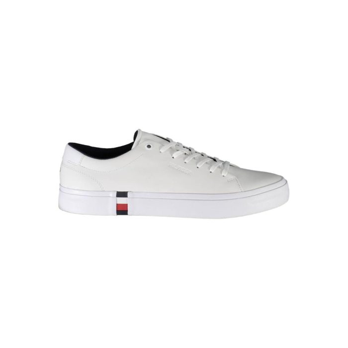 Step up your game with these stunning sneakers from Tommy Hilfiger. Crafted for the modern man with a nod to sustainability, these kicks blend 50% recycled polyester, sleek leather, and durable polyethylene. Accented by contrasting details and the iconic Tommy Hilfiger logo, these white sports shoes infuse classic style with an athletic edge. Perfect for those who value fashion with a conscience.